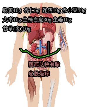 麻黄10g 甘草10g 杏仁5g 生姜10g 大枣10g 连轺10g 赤小豆30g 生梓白皮30g