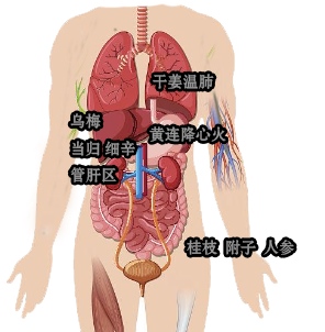 乌梅100g 桂枝30g 人参30g 当归20g 细辛30g 干姜50g 黄连80g 黄柏30g 蜀椒20g 附子炮30g